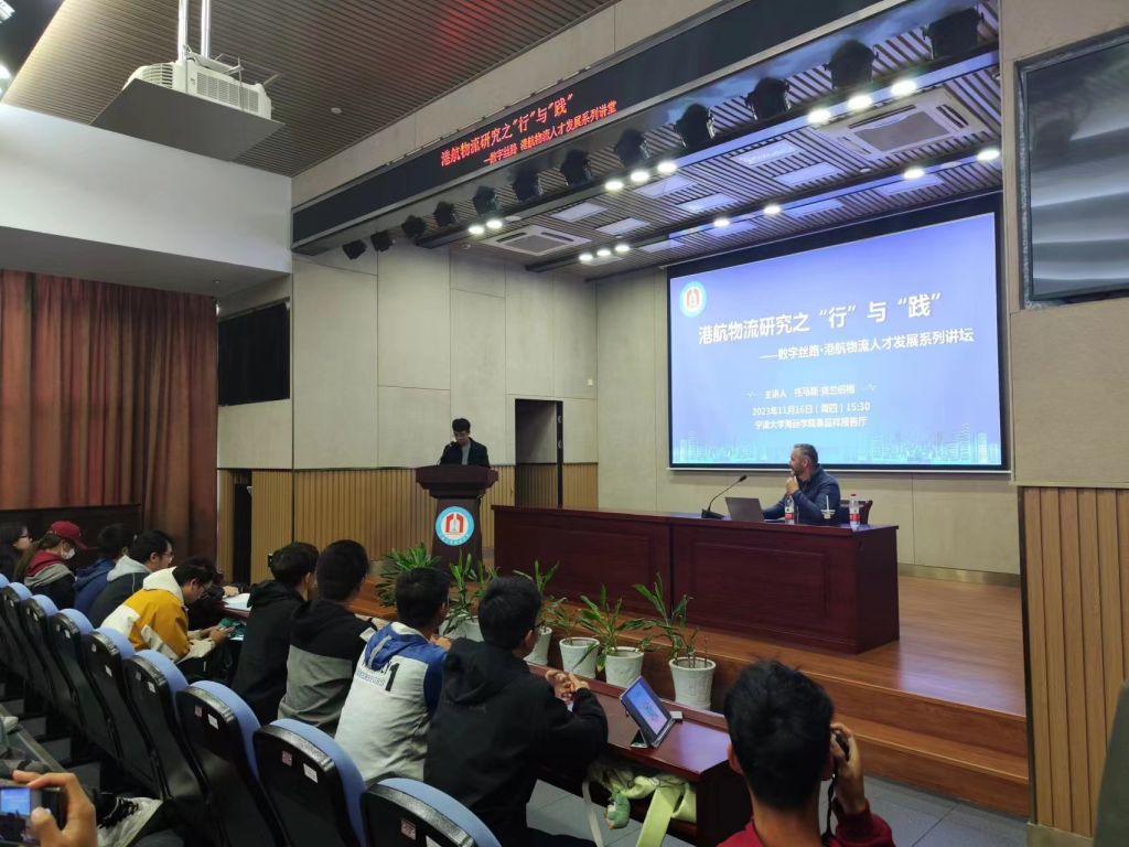 为加强港航物流人才培养,积极响应国家“一带一路”教育共同体建设,促进“数字丝路”学术文化交流,丰富学院国际化办学建设内容,11月16日下午,在梅山校区泰昌祥报告厅,户外露出 举行数字丝路•港航物流人才发展系列讲坛,主讲人为斯洛文尼亚马里博大学物流学院副院长托马斯·克兰伯格,主题为:港航物流研究之“行”与“践”,户外露出 教师、辅导员及各专业学生代表参加讲座。