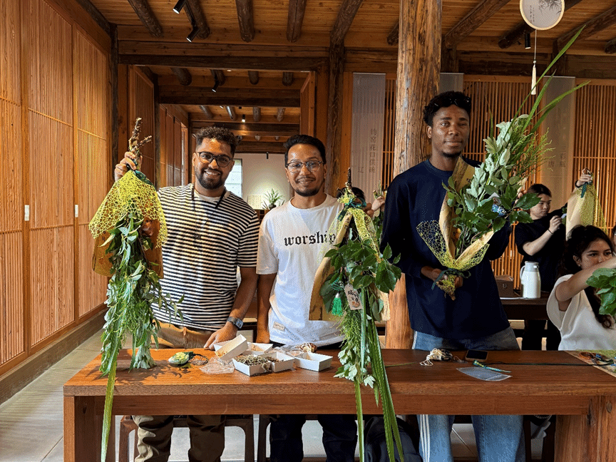 绳编技艺非遗代表性传承人孙人建老师则带领大家制作艾草花束。“端午挂艾是千年习俗,既装点家居,又寄托平安祝愿。”她一边讲解,一边将艾草、菖蒲、紫苏错落叠放,用麻绳固定,点缀菖蒲紫苏后系上彩带,一束饱含祝福的艾草花束便完成了。“第一次接触端午节的传统习俗,感到非常有趣,也很有意义!”活动现场,学院留学生组成“非遗体验团”,成为最活跃的参与者。