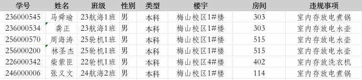 在10月20日-10月26日的文明寝室卫生检查中,根据《宁波大学学生住宿管理办法》宁大政〔2023〕127号规定,我院共计查处违禁电器6起,现将基本情况通报如下。