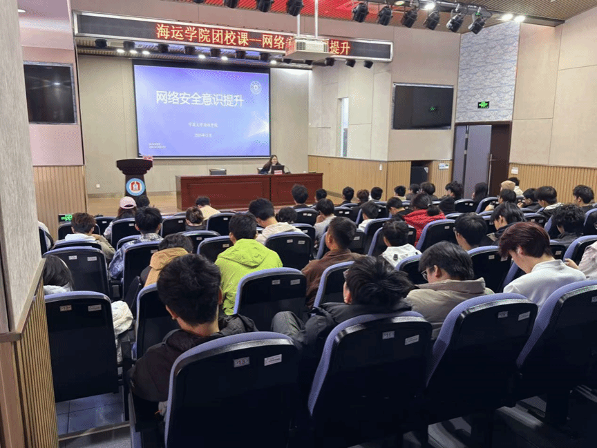 为帮助学生明晰成长方向、强化网络安全防护意识,11月26日,宁波大学海运学院团委在海运南楼泰昌祥报告厅成功举办“网络安全意识提升”主题团课,本次团课邀请学院组织员邱巧慧老师担任主讲人 。