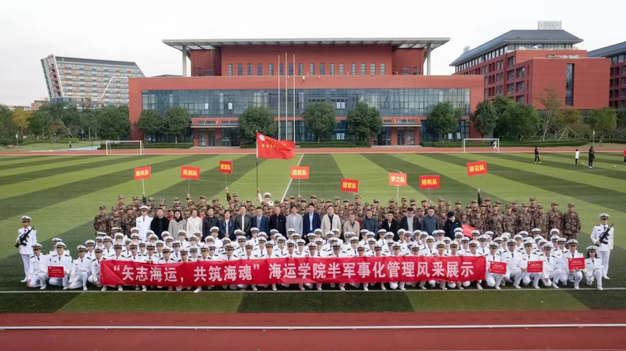 11月20日,海运学院在梅山校区操场隆重举行了以“矢志海运,共筑海魂”为主题的半军事化管理风采展示活动。学院党委书记刘忠秀、梅山校区管委会副主任吕建慧、学院党委副书记张宾、党委委员陈跃华、工会主席苗鹤,以及梅山校区保卫部的陈红军、谢雨龙等多位学院领导和老师莅临参与。同时,学院系主任、退休老教师代表、青年教师代表、行政教辅老师,以及半军事化管理大队的学生教官和全体学员也齐聚一堂,共同见证了这一盛况。