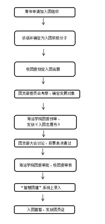 校团委审核海运学院新发展团员信息,审核通过后,海运学院团委指导团支部将新发展的团员信息录入“智慧团建”系统,到师生服务大厅5号窗口制作团员证,将入团志愿书放入新发展团员的档案中。校团委统一组织入团宣誓。