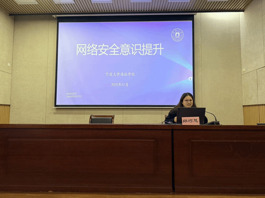为帮助学生明晰成长方向、强化网络安全防护意识,11月26日,宁波大学海运学院团委在海运南楼泰昌祥报告厅成功举办“网络安全意识提升”主题团课,本次团课邀请学院组织员邱巧慧老师担任主讲人 。