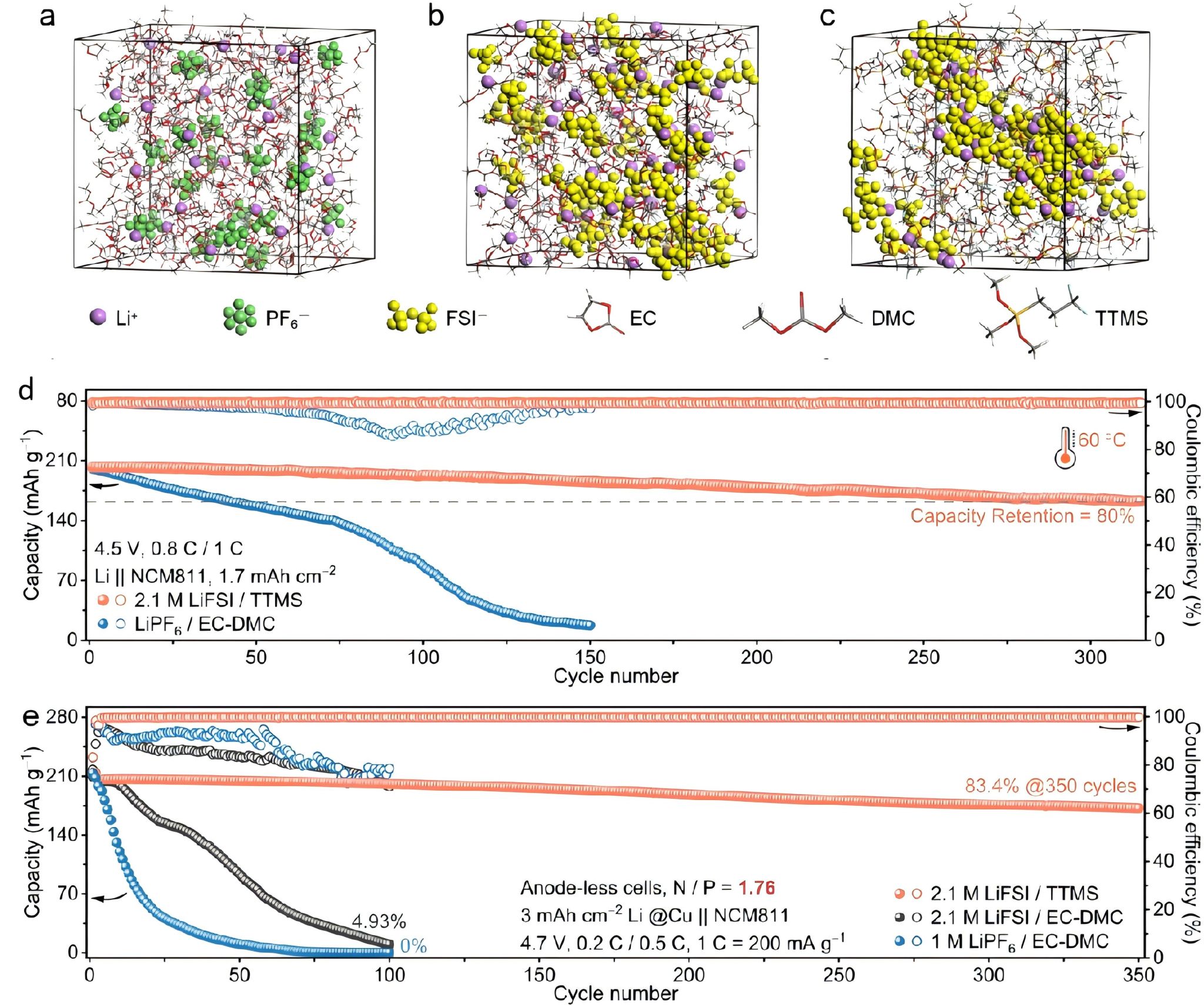 随着长续航电动汽车/船舶、便携式电子设备和无人机等新兴应用的快速发展,市场对高能量密度电池的需求日益增长。目前,锂离子电池受限于金属氧化物正极和石墨负极的较低容量,能量密度通常仅为150-250 Wh/kg。为提升能量密度,开发具有高电压的高容量电极材料至关重要。采用富镍层状氧化物正极(LiNi0.8Co0.1Mn0.1O2,NCM811)的高电压锂金属电池是实现高达500 Wh/kg能量密度的最具前景的方案之一。然而,在超高压(>4.6 V)条件下,NCM811正极与锂负极界面均会发生严重的副反应。为解决这一问题,研究者们已开发多种电解质体系,但仍存在分解问题,导致工作电压受限且循环性能不足。本研究提出采用兼具强溶剂化(─OCH3)与弱溶剂化(─CF3)基团的不对称氟化单一溶剂——三甲氧基(3, 3, 3-三氟丙基)硅烷(TTMS)。通过构建2.1 mol/L的LiFSI/TTMS电解质体系,其独特的阴离子主导溶剂化结构及富无机物界面层,使NCM811正极与锂金属负极实现高度兼容。该电解质使Li||NCM811电池在4.8 V超高压下稳定循环,300次循环后容量保持率达84.5%。即使在高温(60oC)和贫负极(N/P=1.76)的苛刻条件下,电池仍能保持300次循环后容量衰减低于20%的优异性能。本研究证实了电解质调控策略对开发超高压长循环电池系统的有效性。