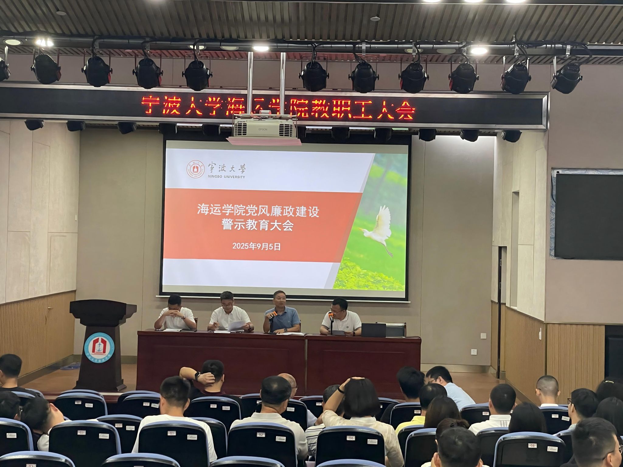 为深入贯彻党的二十大关于全面从严治党战略部署,落实学校党委“清廉宁大”建设要求,9月5日,宁波大学海运学院在学院南楼泰昌祥报告厅召开2025年党风廉政建设教育警示大会。学院领导班子成员、全体教职工共80余人参会,会议由学院党委书记刘忠秀主持。